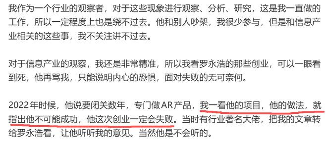 还强调我方2022年就预判罗永浩AR创业会失败,其时有行业大佬把著作转给他,可惜没被秉承。如今AR姿首无下文,刚巧印证我方的判断,而且罗永浩十足反驳不了。